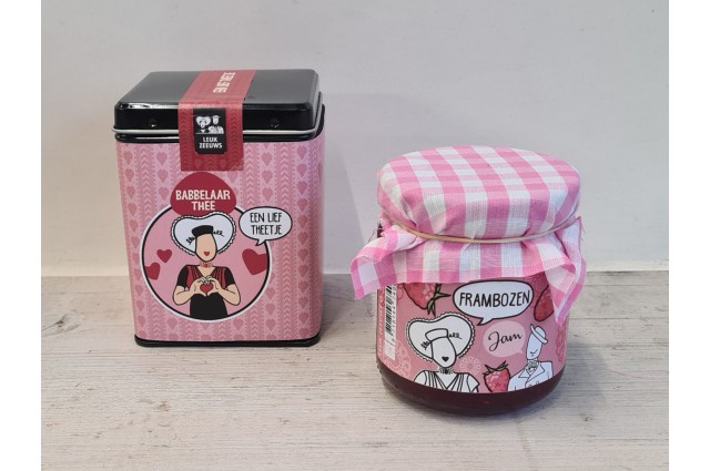 Jam Een glazen potje met stoffen 'hoedje' over het dekseltje. De inhoud bestaat uit 225 gram...