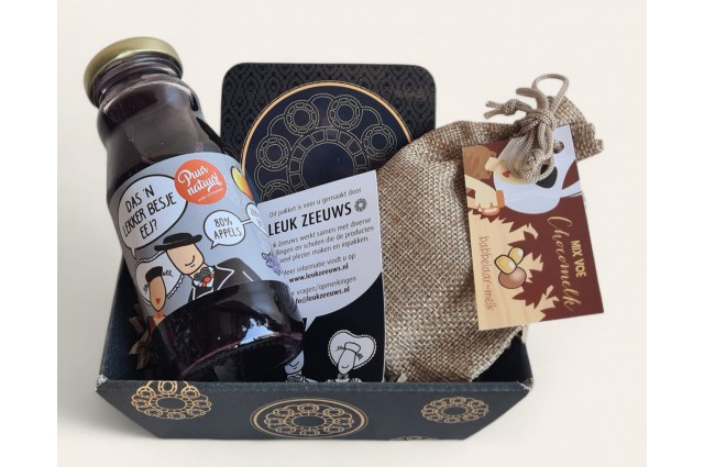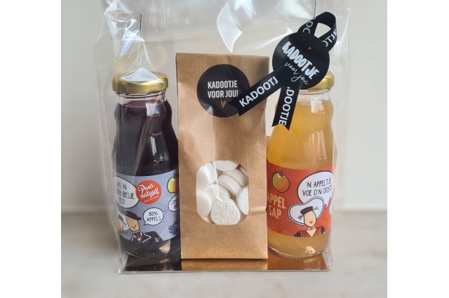 Een kadopakket wat bestaat uit een potje appelstroop, grove mosterd en aardbeienjam. Deze...