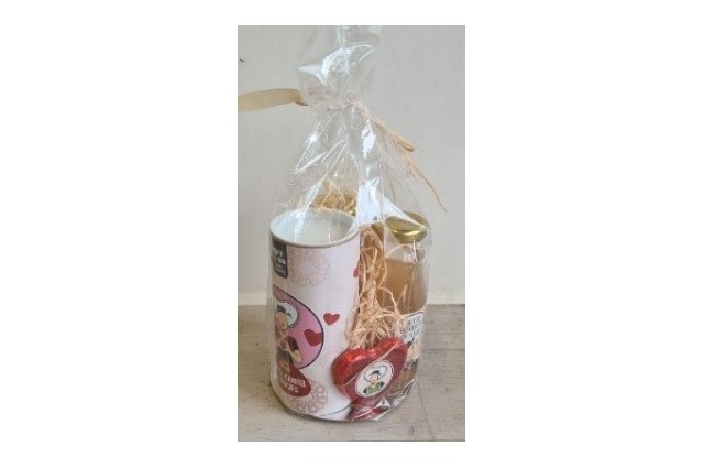 Een kadopakket wat bestaat uit een potje bloemenhoning en grove mosterd. Op de afbeelding is...