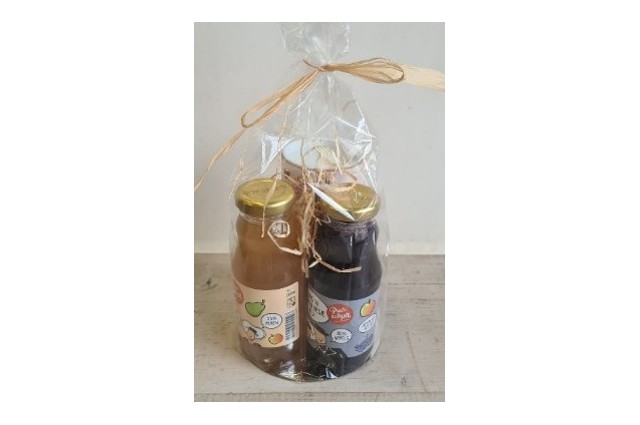 Een kadopakket wat bestaat uit een potje kruisbessenjam en bramenjam. Op de afbeelding is...