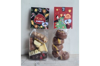 Zakje gevuld met mooie kerstbonbons. Keuze uit twee soorten. De kerstbonbons hebben vormen die kerst gerelateerd zijn en verschillende smaken. De Bonbons met de afbeelding van de boom hebben de vorm van een Zeeuwse knop en de smaak melk.