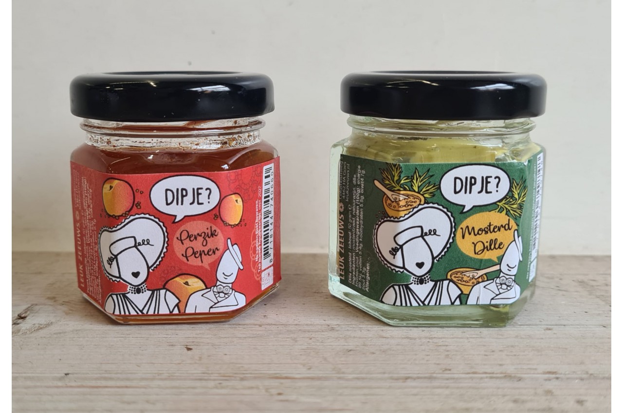 Leuke kleine dipjes in de smaak perzik/peper of mosterd dille. Lekker voor bij de borrel met een dipstokje.