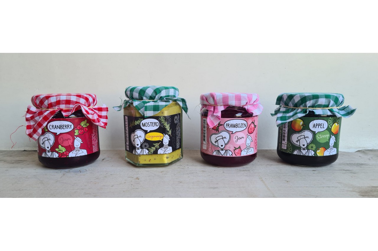 Heerlijke mosterd of appelstroop, met leuk etiket en hoedje.