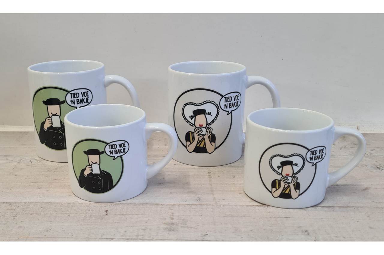 Mooie mokjes met de afbeelding van een boerin met de tekst tied voe 'n bakje.