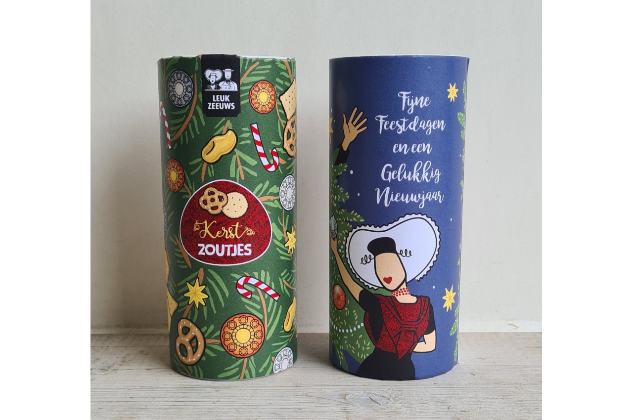 Er is keuze uit twee soorten. De groene koker heeft een feestelijke afbeelding van o.a. pretzels en de Zeeuwse knop. Deze is gevuld met 60 gram pretzelmix. De blauwe koker is gevuld met 10 lekkere appel kaneelkoekjes en heeft de afbeelding van een kerstboom, boer en boerin met tekst Fijne Feestdagen en een Gelukkig Nieuwjaar.
