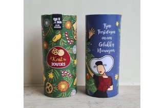 Een mooie koker gevuld met een lekkere snack. Ook leuk om zo als kadootje te geven.