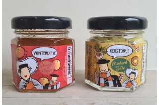 Lekkere dipjes voor bij de borrelplank. Ook leuk samen met dipstokjes. Er is keuze uit de winterdip met de smaak perzik/peper of de kerstdip met de smaak mosterd/dille.