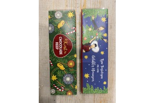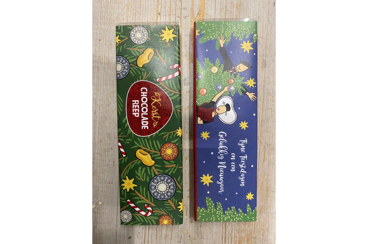 Lekkere chocoladerepen met de keuze uit twee afbeeldingen. Op de ene staan de boer en boerin rond de boom met de tekst fijne feestdagen. De andere heeft een patroon met kerst gerelateerde vormen.
