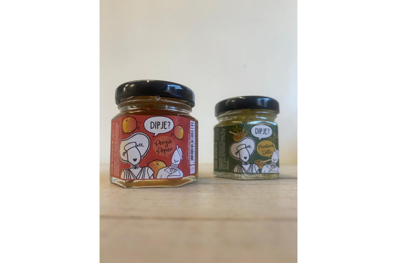 Lekkere dipjes in de smaak perzik/peper of mosterd/dille. Leuk samen met een dipstokje bij de borrel.