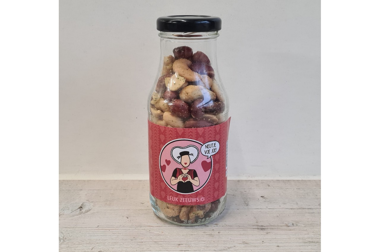 Lekker nootjes om te snacken in glazen flesje. De fles heeft een afbeelding van een boerin met hartjes.