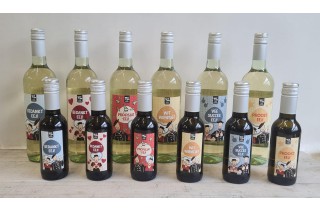 1 liter witte wijn met leuke afbeelding voor verschillende gelegenheden.