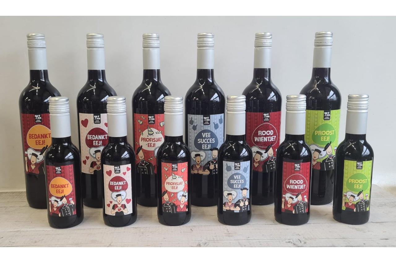 0.5 liter rode wijn met leuke afbeelding voor verschillende gelegenheden.